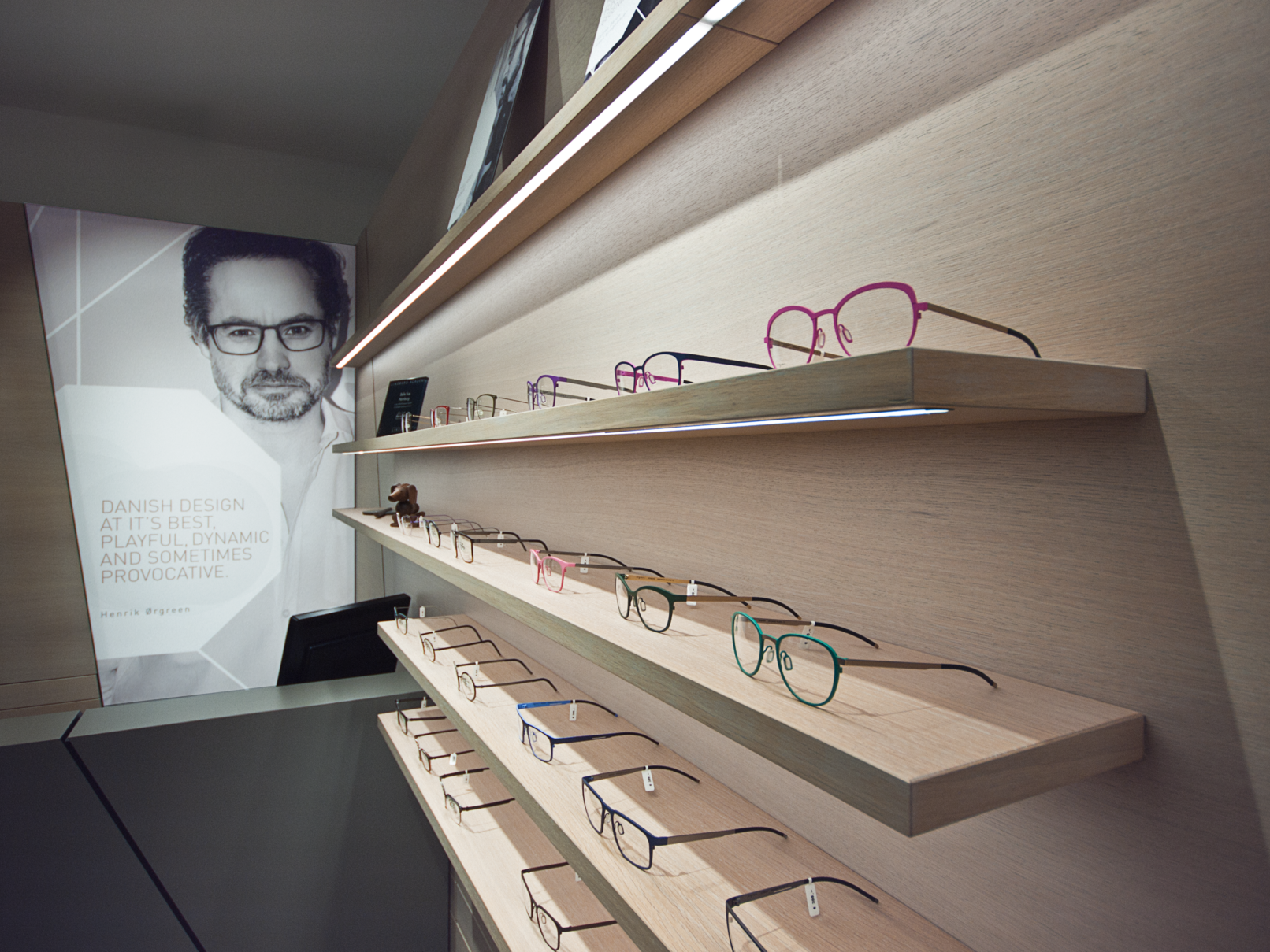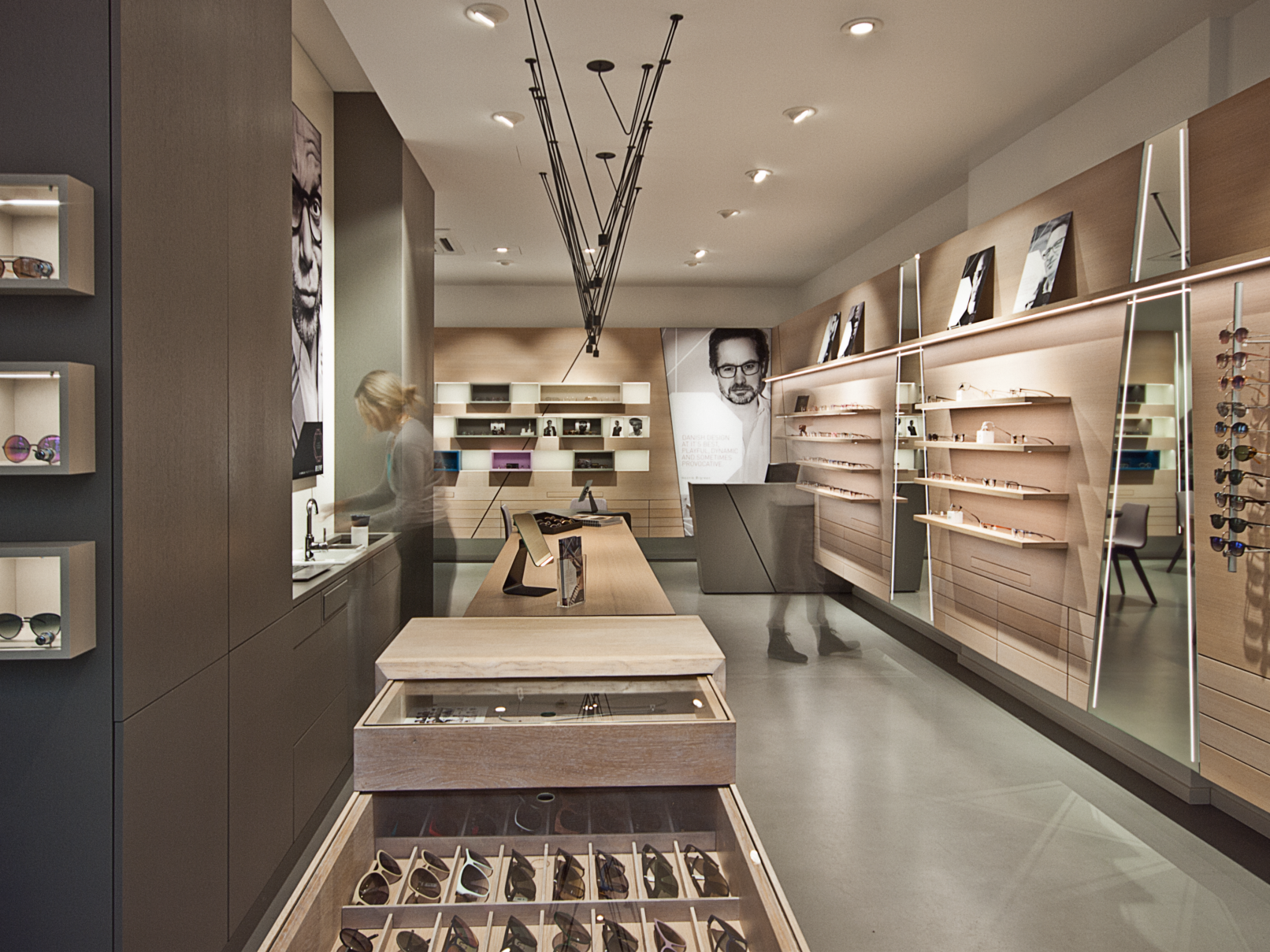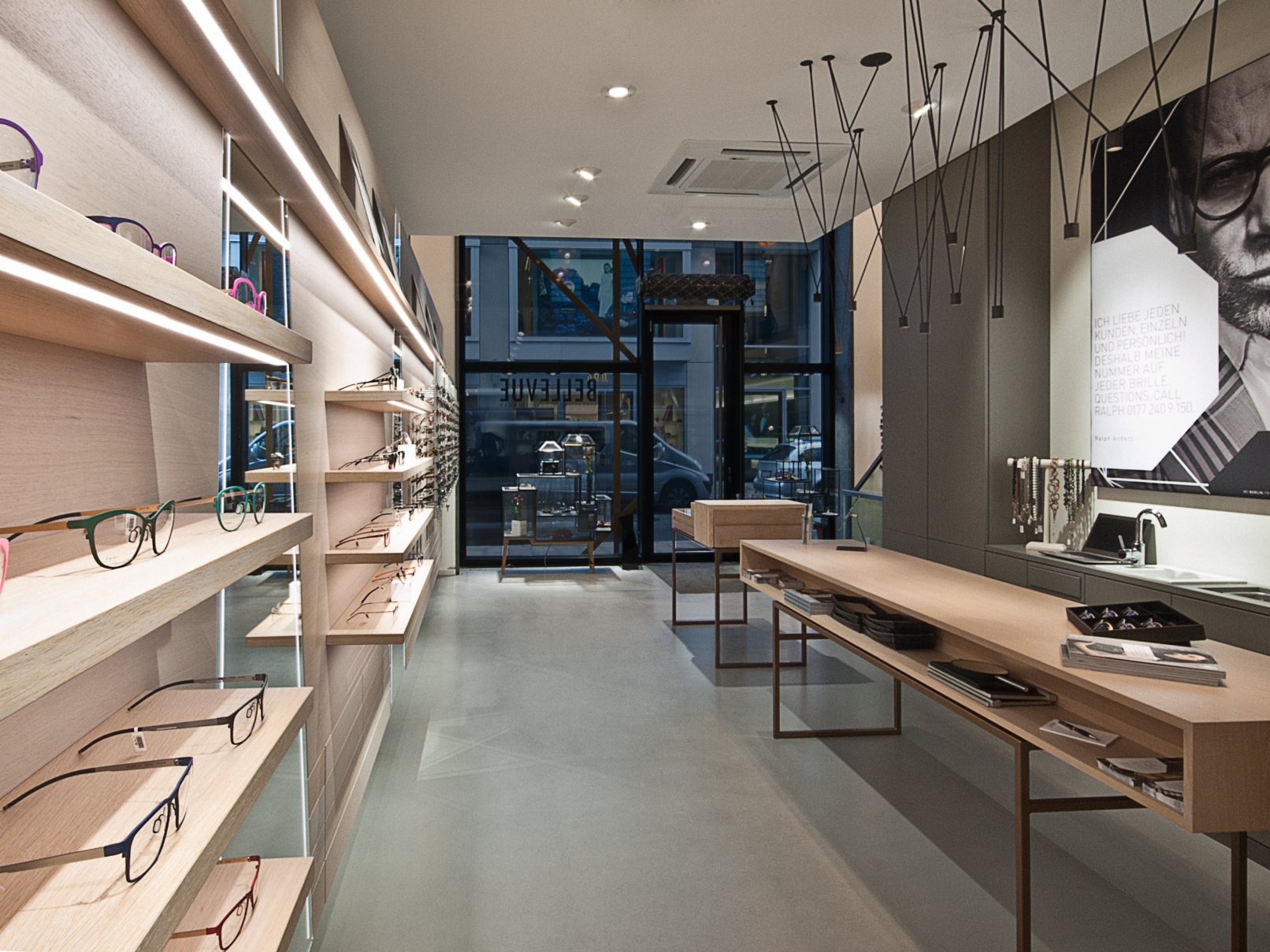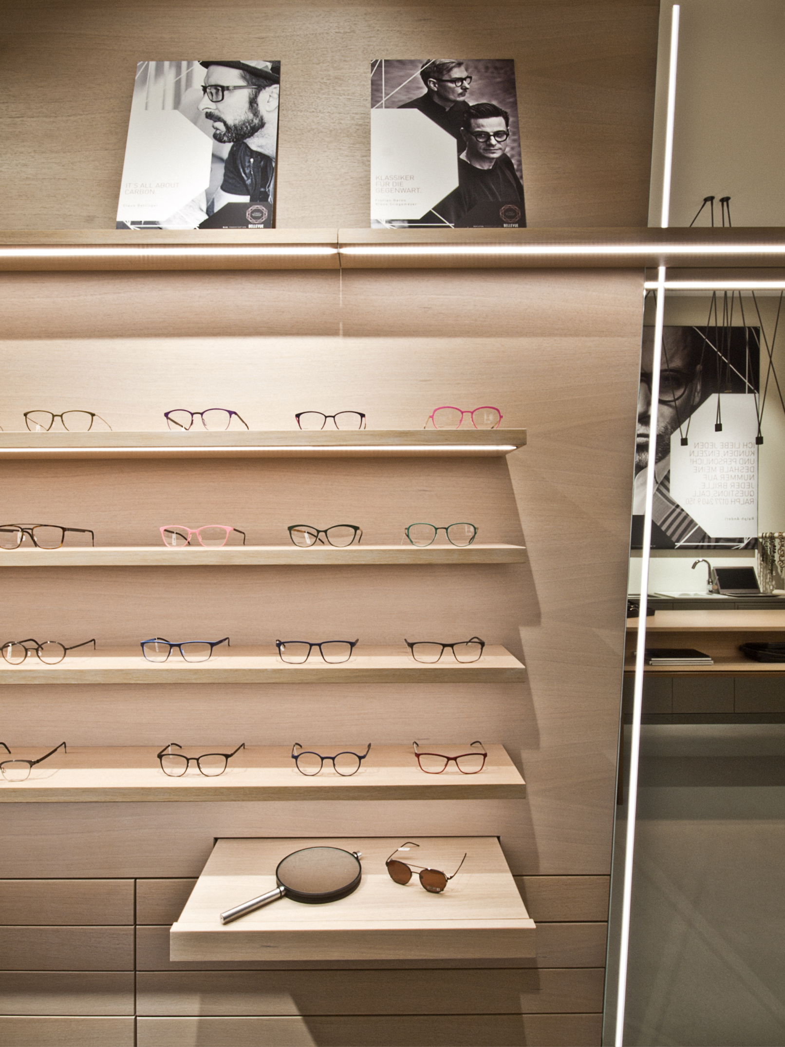 As soon as the visitor enters the store, he senses that high-quality, authentic and individual collections can be experienced here. The interior design is pure, clear and noble; it directs – perfectly illuminated – the customer’s full attention to the main protagonist: the various eyewear brands. The interior design directly picks up the idea of the corporate design: The lines of the logo reappear again and again in the furniture up to the filigree lighting object located in the center.