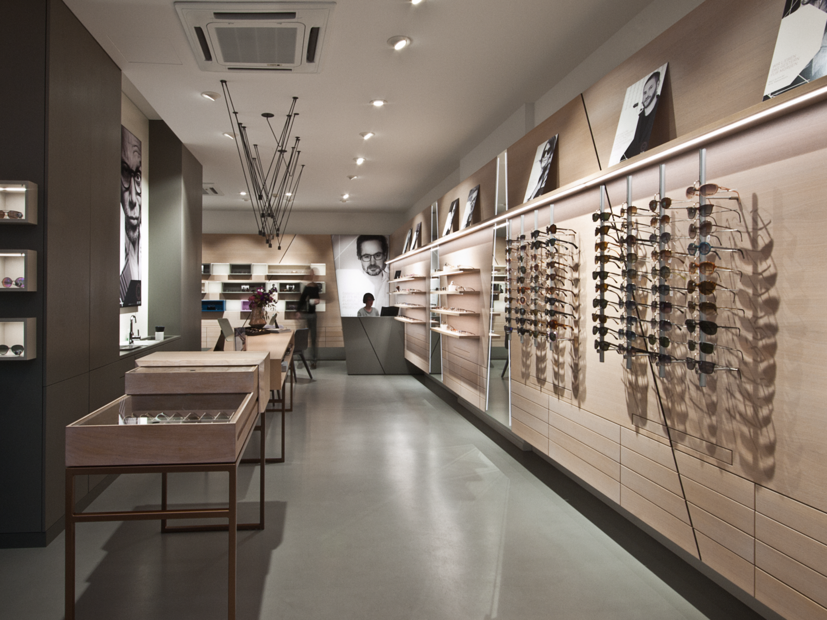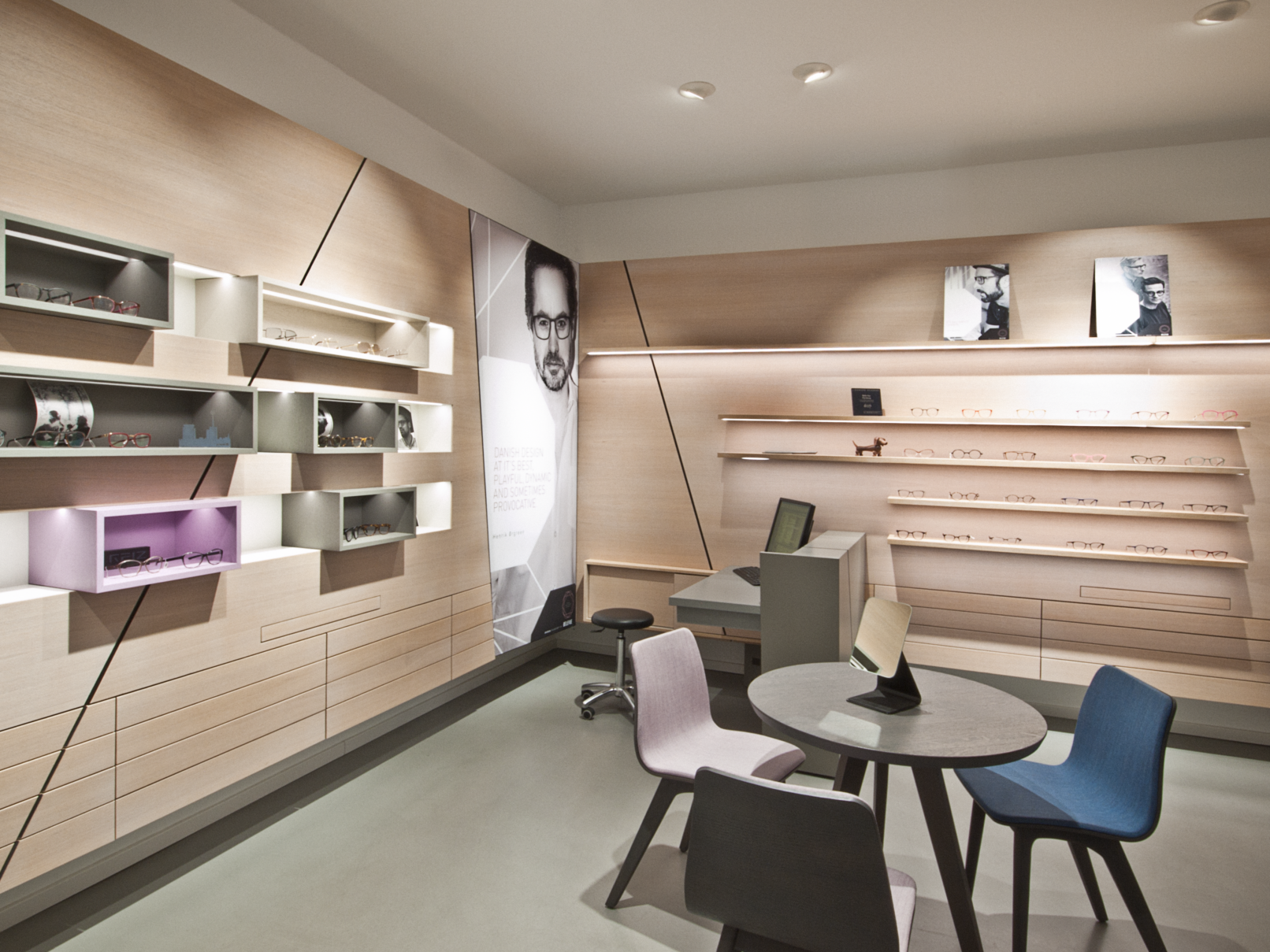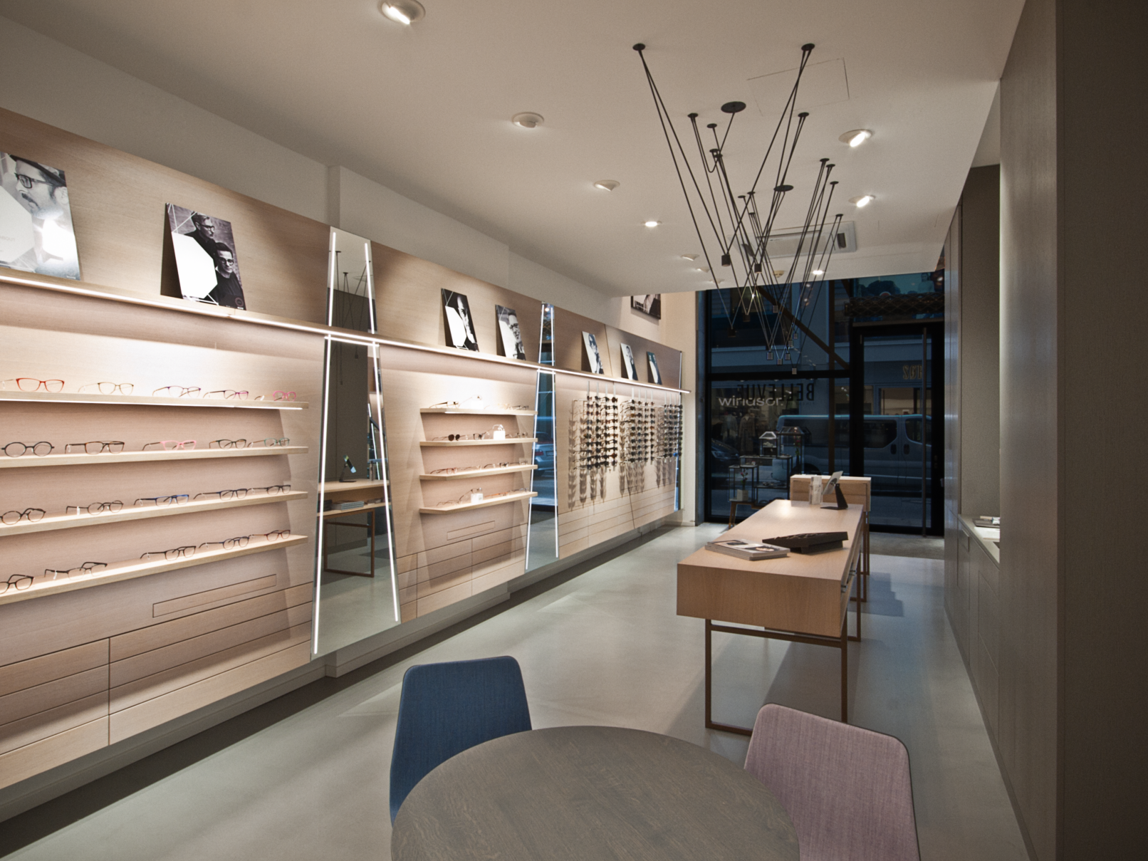 As soon as the visitor enters the store, he senses that high-quality, authentic and individual collections can be experienced here. The interior design is pure, clear and noble; it directs – perfectly illuminated – the customer’s full attention to the main protagonist: the various eyewear brands. The interior design directly picks up the idea of the corporate design: The lines of the logo reappear again and again in the furniture up to the filigree lighting object located in the center.