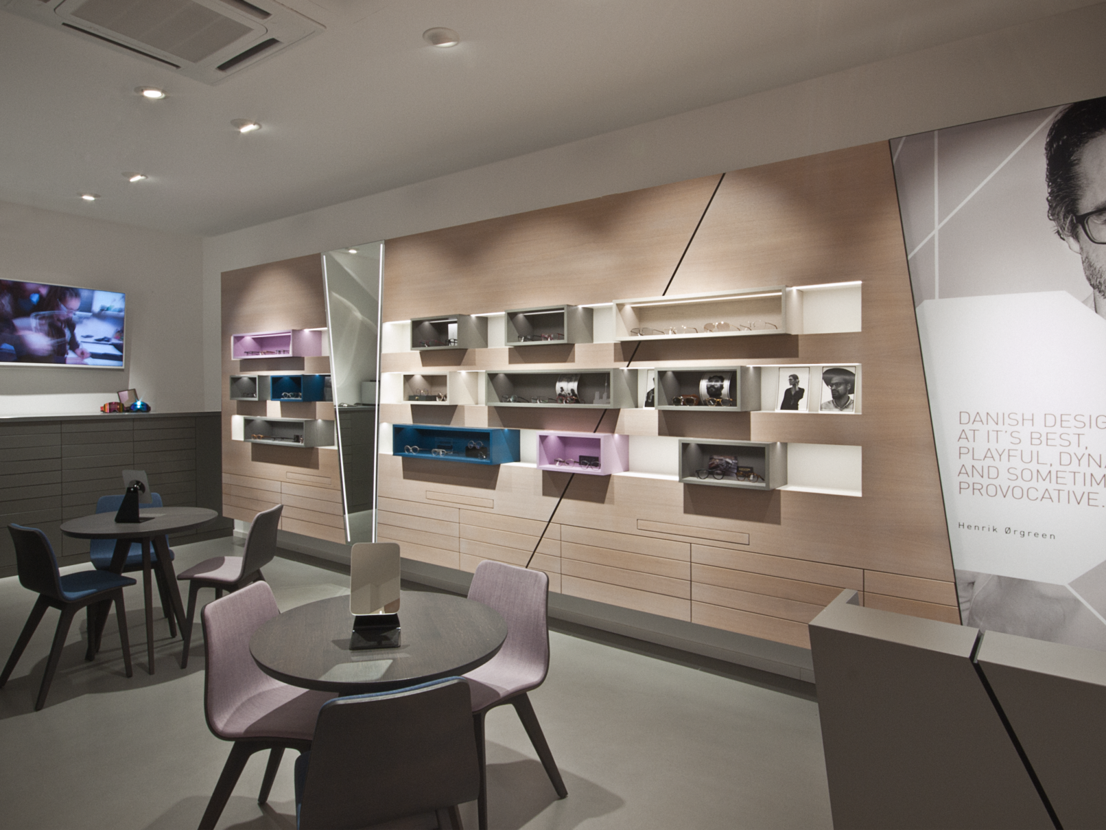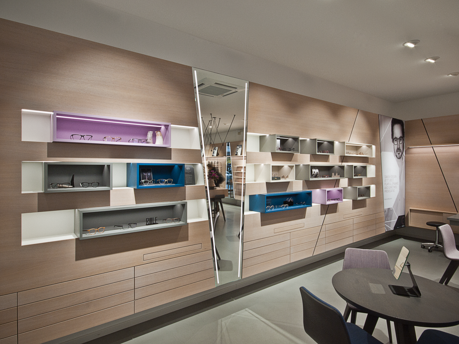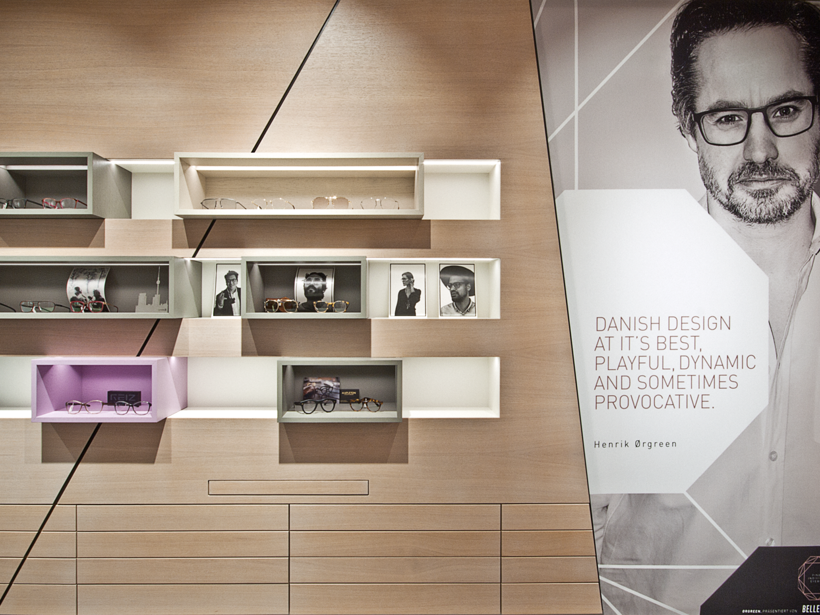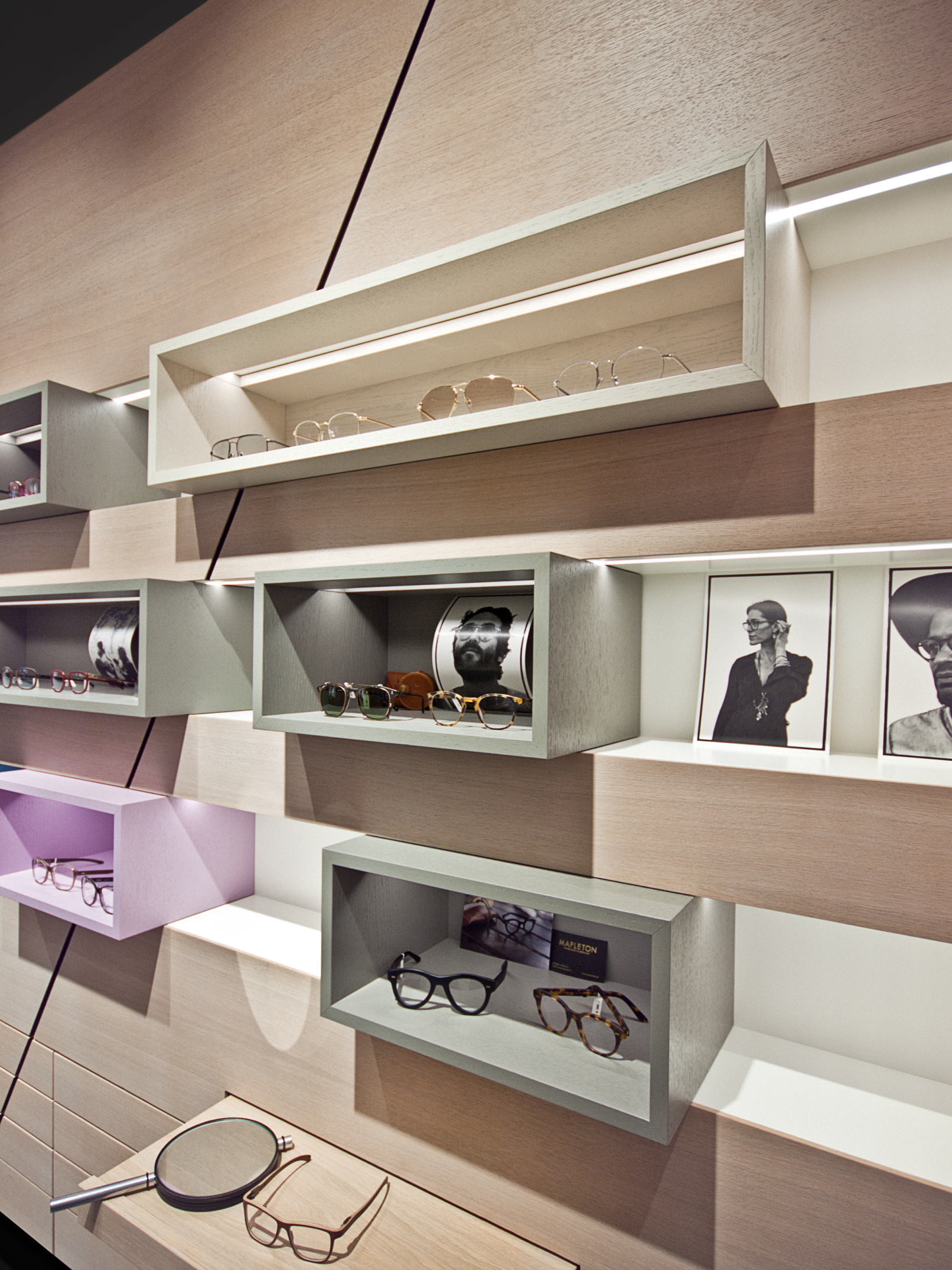 As soon as the visitor enters the store, he senses that high-quality, authentic and individual collections can be experienced here. The interior design is pure, clear and noble; it directs – perfectly illuminated – the customer’s full attention to the main protagonist: the various eyewear brands. The interior design directly picks up the idea of the corporate design: The lines of the logo reappear again and again in the furniture up to the filigree lighting object located in the center.