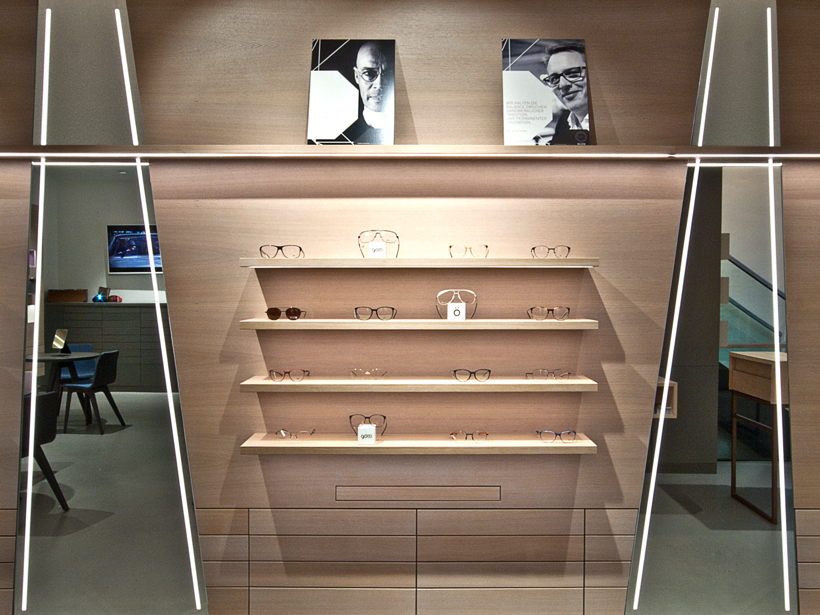 The different collections become one big whole through the uniform presentation – the design bracket is the furniture band on the wall, which draws the customer to the back of the store. It serves both as a presentation area for the eyewear brands and as a stockroom in the lower area. Once the choice of glasses has been made, the customer always sees them in the right light thanks to the lighting integrated in the mirror!