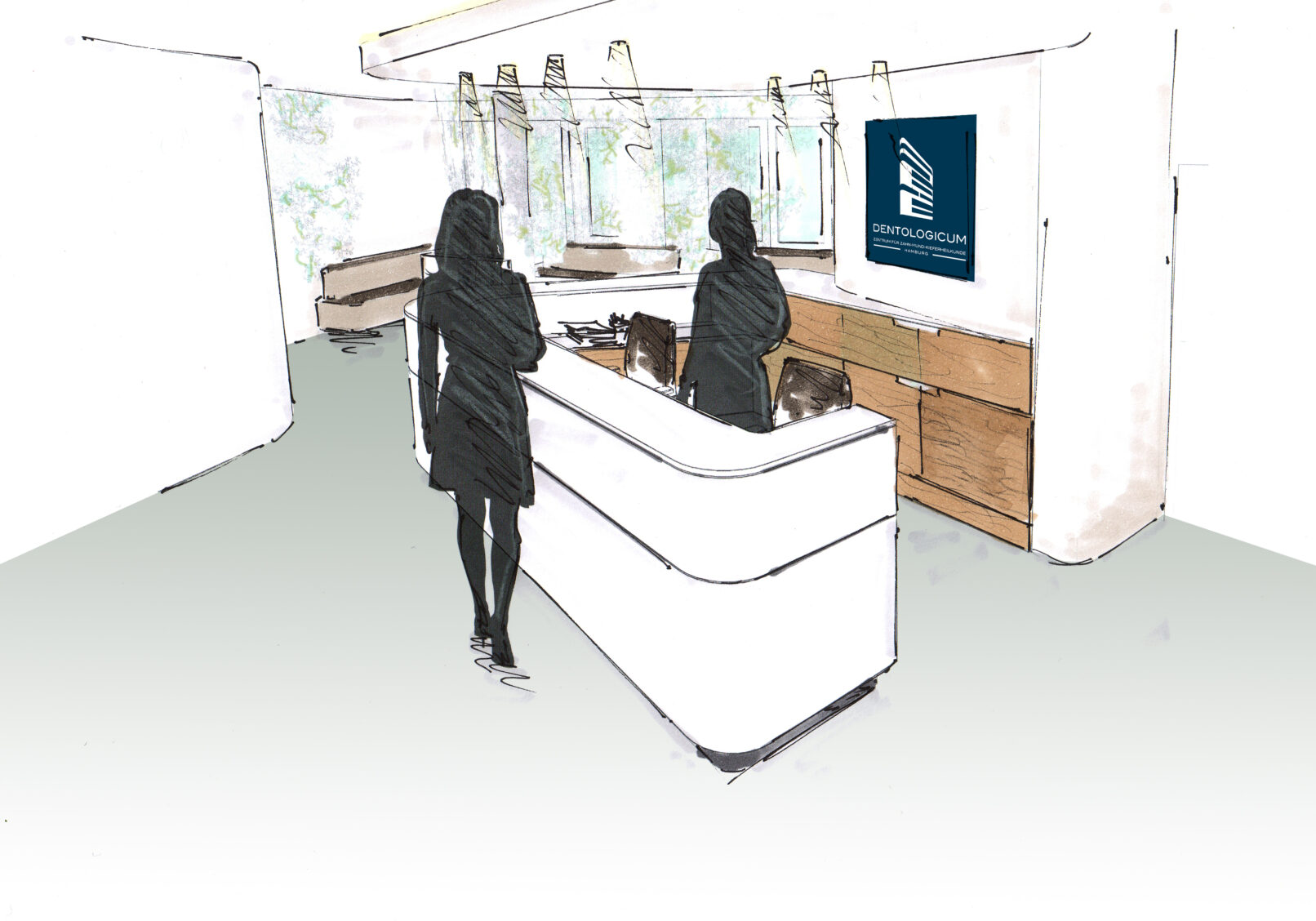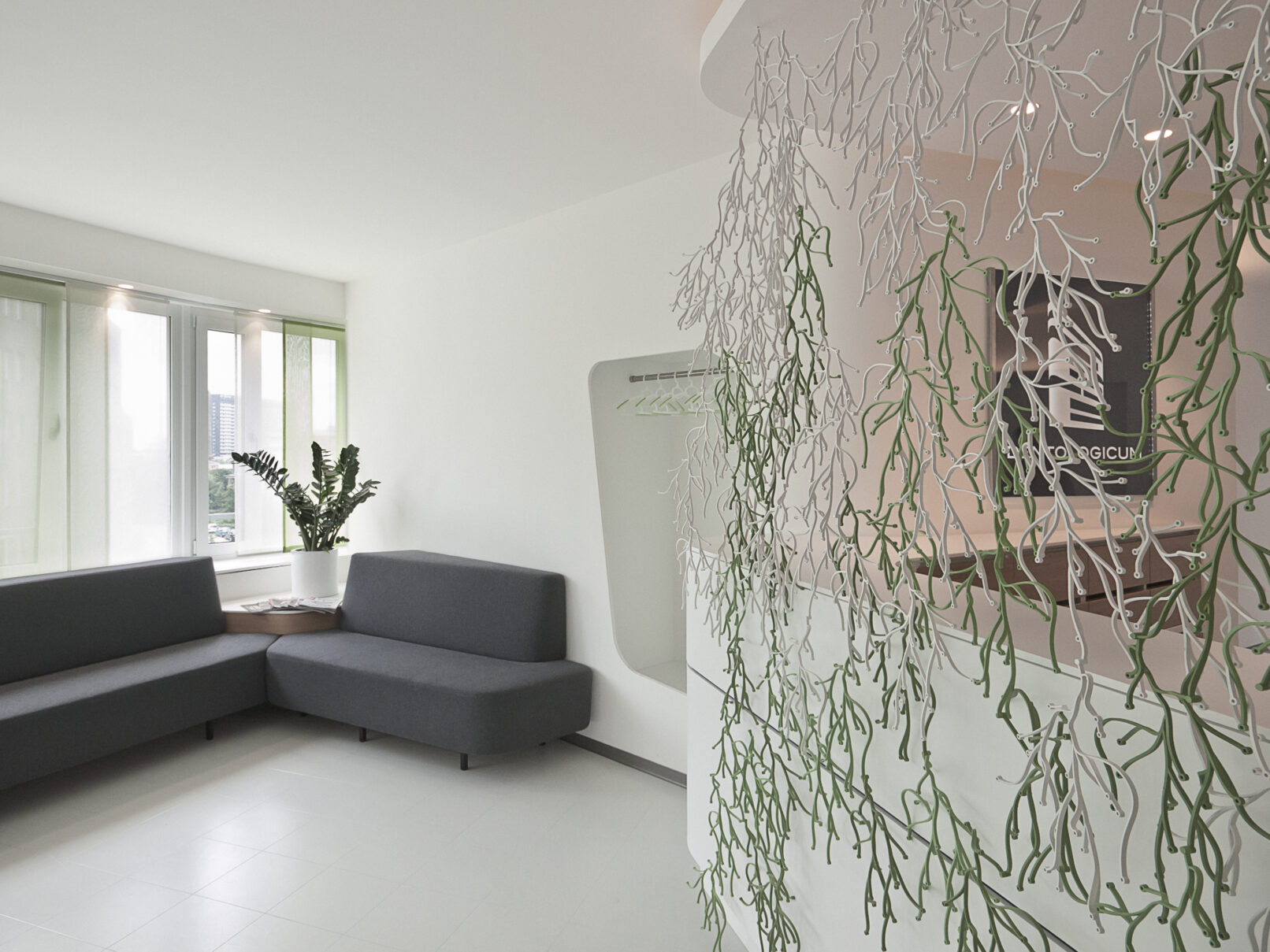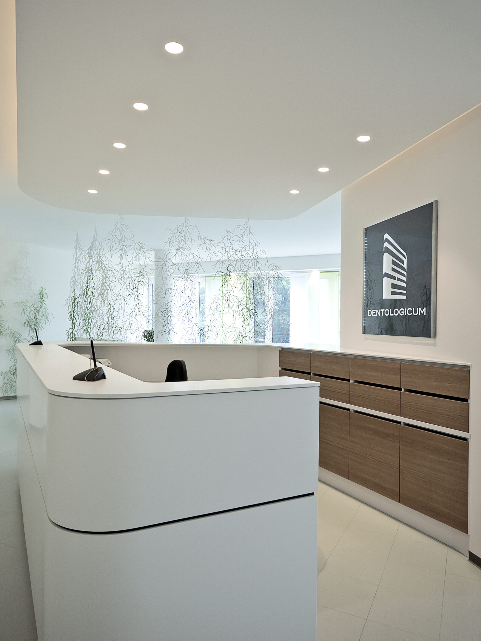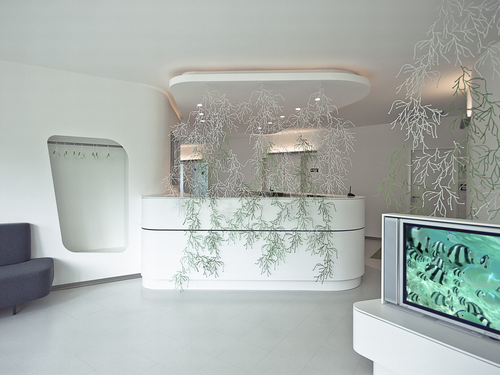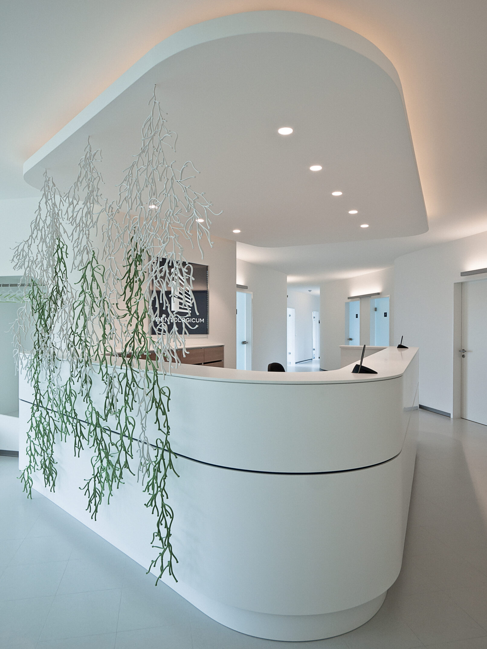 The very first seconds of entering a dental practice are crucial for this feeling. For this reason, the reception and waiting area has been designed as one room and thus exuding trust and transparency. In addition, the color combination of white and accentuated green was not chosen without reason in the bright and light-flooded room: White, the color of purity, perfection and flawlessness meets green, the color of nature, hope, the sign of freshness and health. Together they form a good duo and are complemented by wooden fronts and fabric seating. The tendril element serves not only as decoration, but also has a lively effect and works well as a visual space divider between the areas.