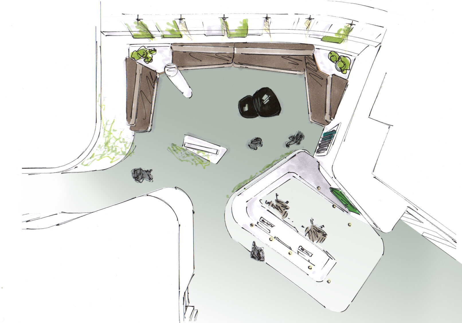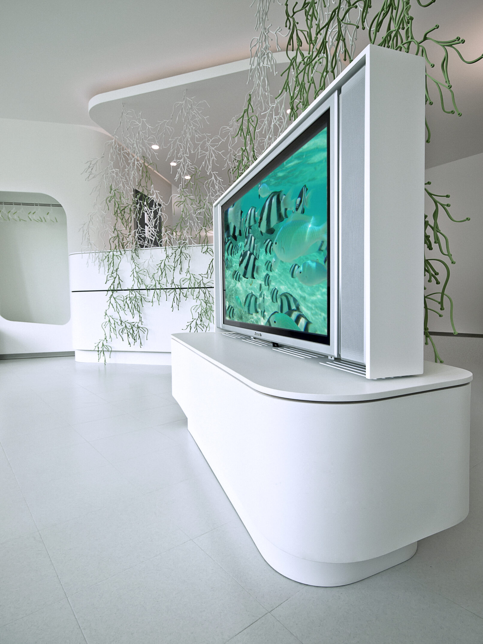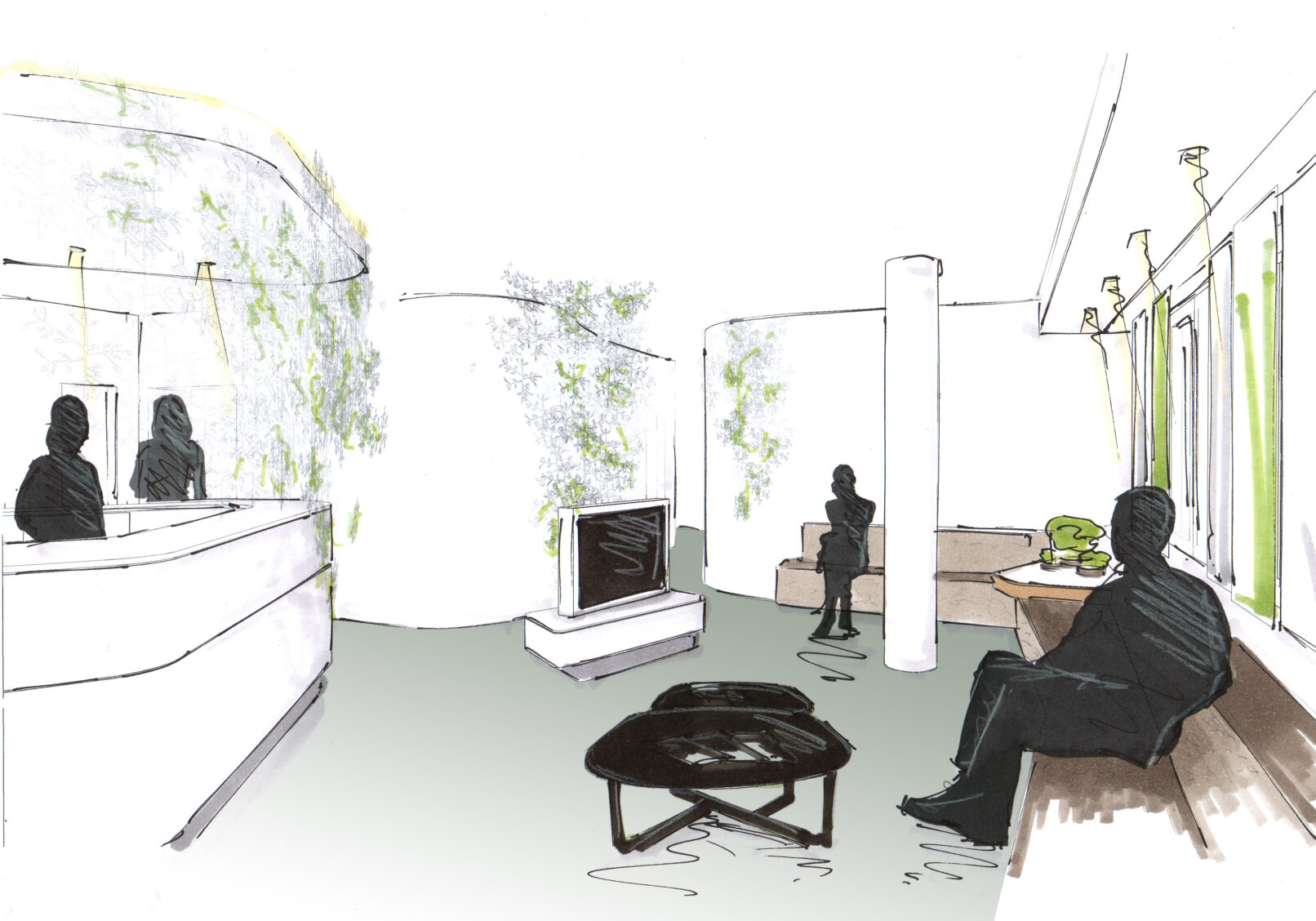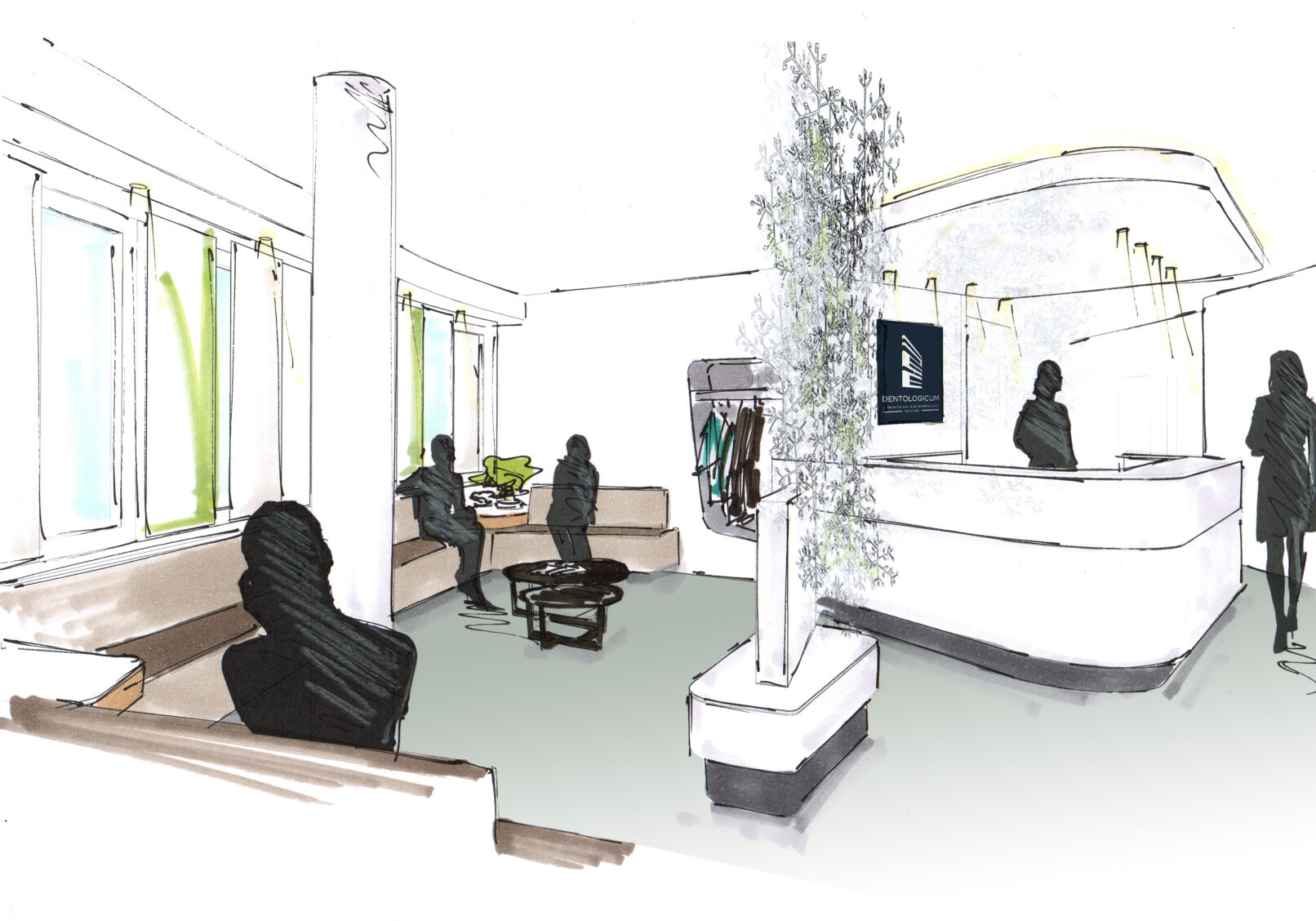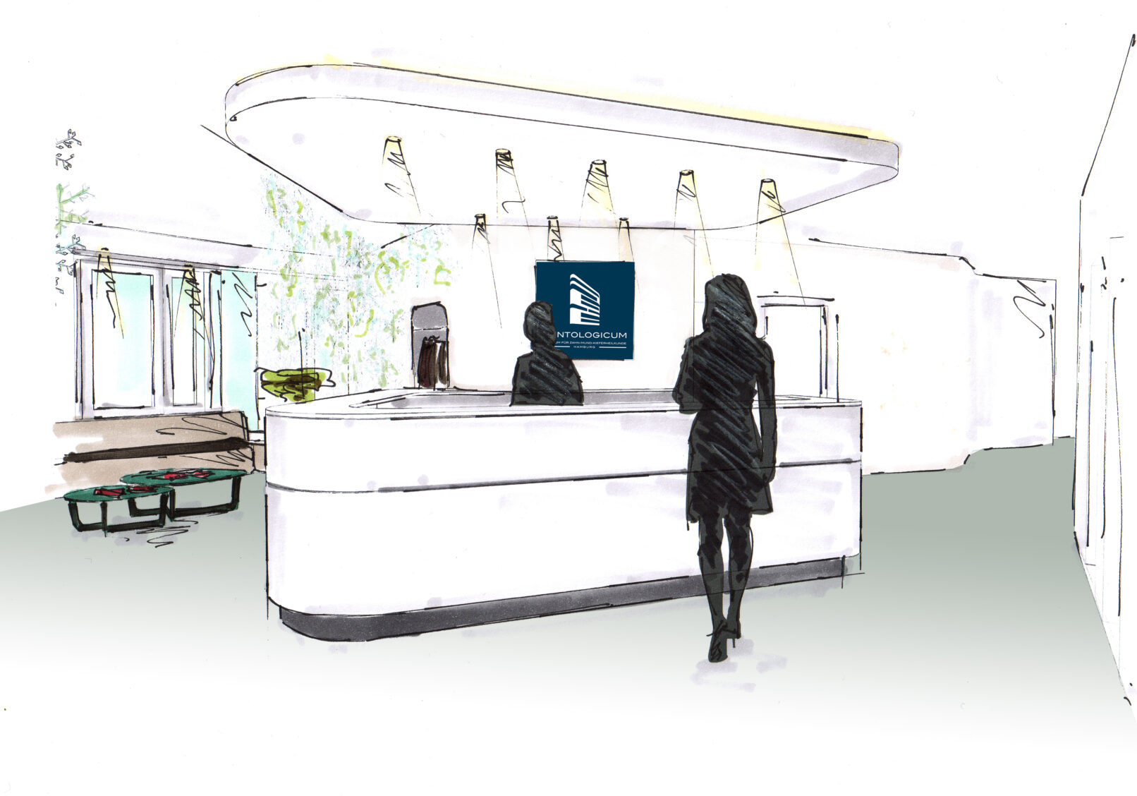 The very first seconds of entering a dental practice are crucial for this feeling. For this reason, the reception and waiting area has been designed as one room and thus exuding trust and transparency. In addition, the color combination of white and accentuated green was not chosen without reason in the bright and light-flooded room: White, the color of purity, perfection and flawlessness meets green, the color of nature, hope, the sign of freshness and health. Together they form a good duo and are complemented by wooden fronts and fabric seating. The tendril element serves not only as decoration, but also has a lively effect and works well as a visual space divider between the areas.