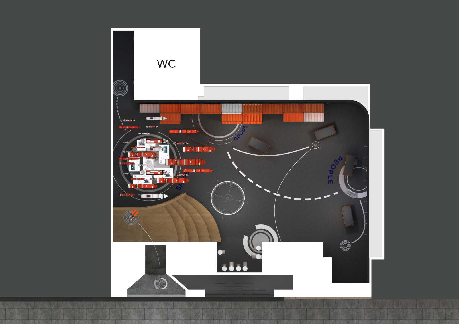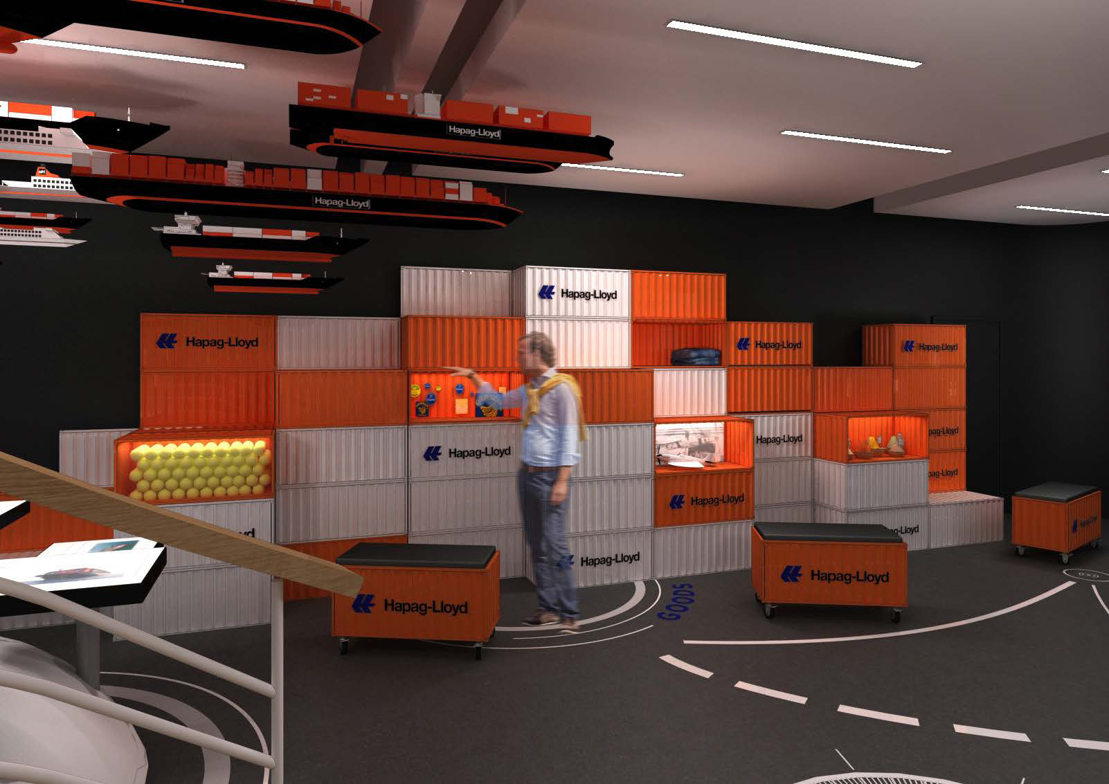 The concept divides the core of Hapag-Lloyd into three main themes: The areas of goods, ships and people form the company in their unity – in the past, in the present and in the future. Only the interaction of all players can guarantee smooth operations and continuous development. Thus, the aspects are not presented separately, but staged in logical harmony with each other.