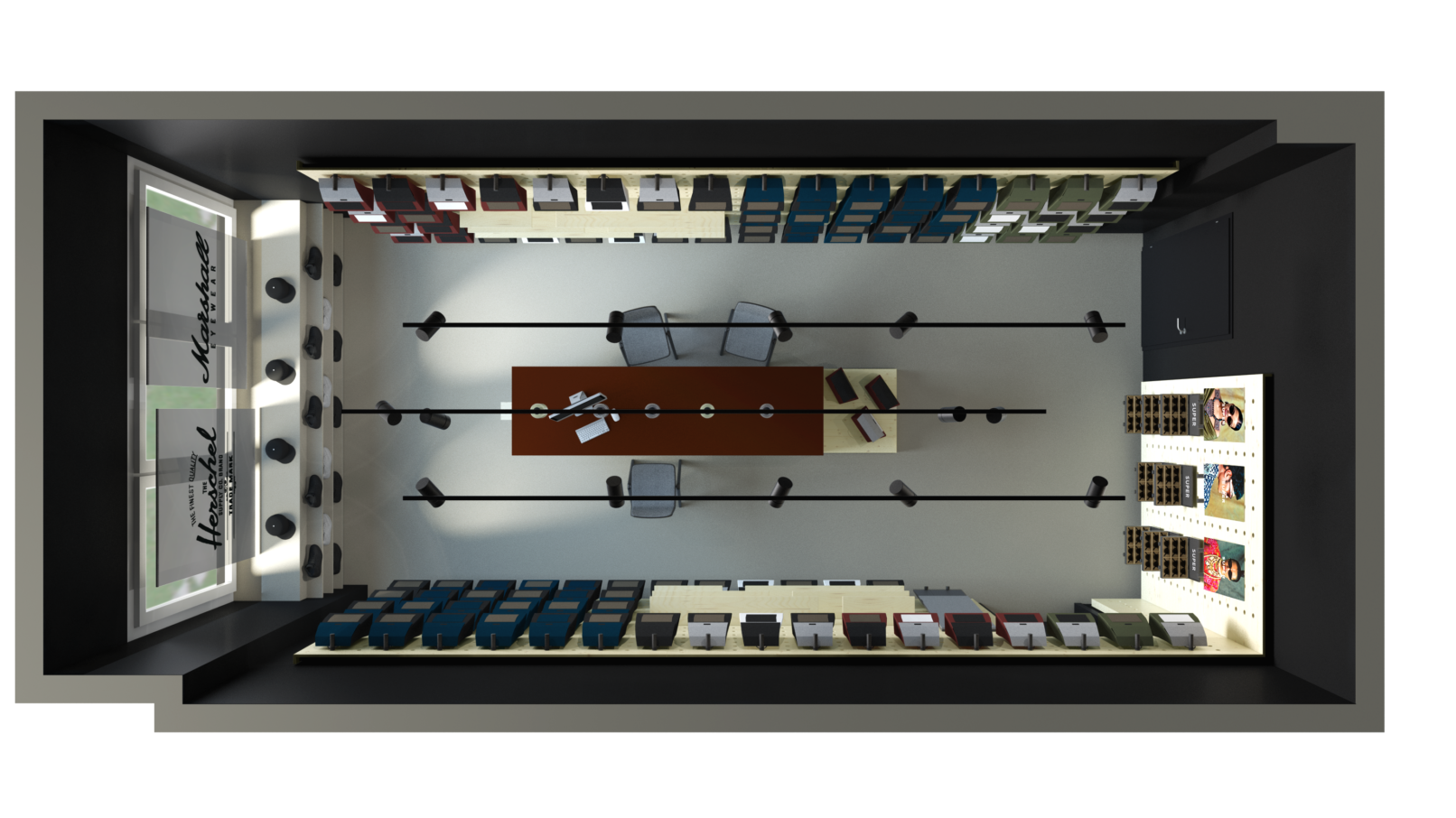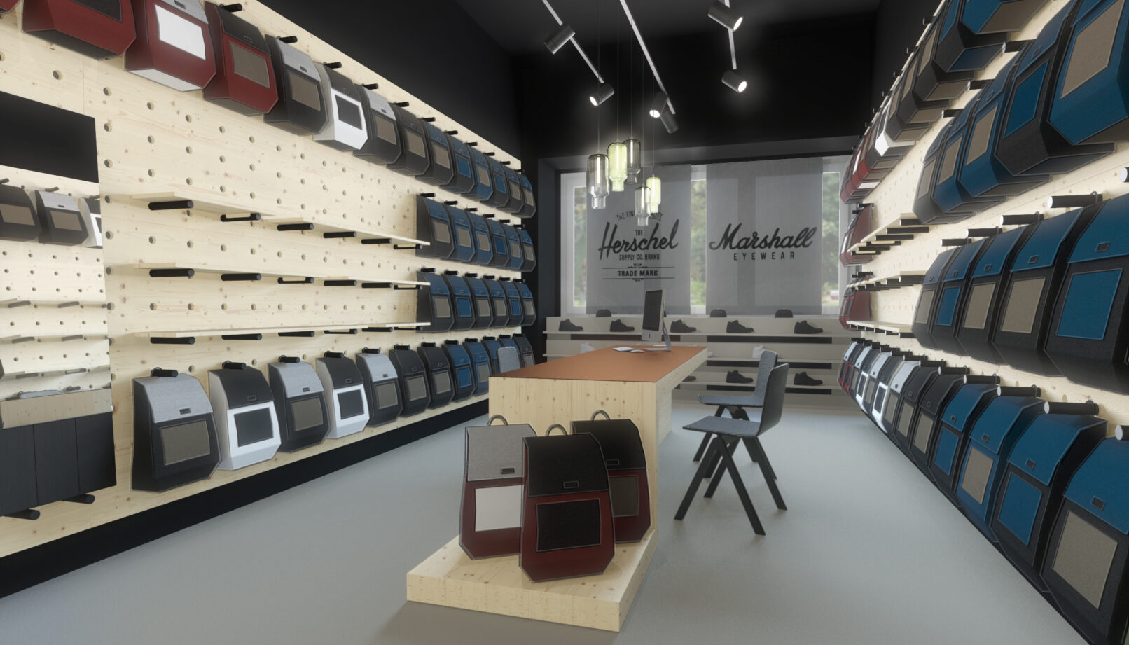 Only about 35 sqm showroom space and a tight budget for the implementation – not exactly ideal conditions for the presentation of three brands! In addition, the presentation form should also be extremely flexible, because each backpack collection of the main brand Herschel varies in color / fabric combinations. It is important that the entire collection is presented frontally, so that the customer can see the entire spectrum directly in front of his eyes.