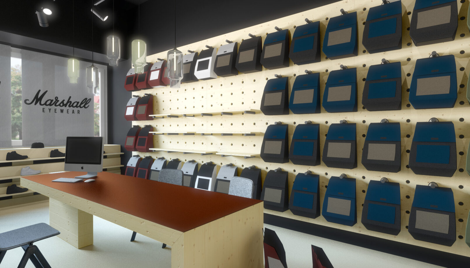 The solution: thanks to a grid system of holes in the wooden walls, it is possible to adapt the entire system to the individual new collection. The dark wall and ceiling then put the wooden surfaces in the right light and offer a very natural and lively presentation.