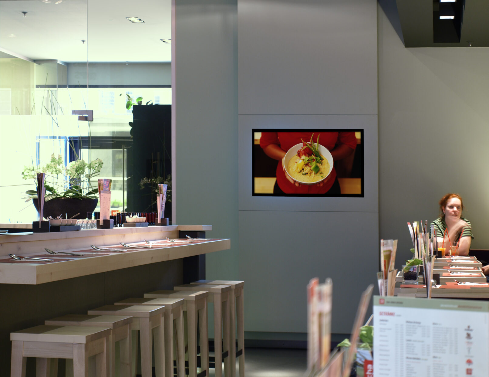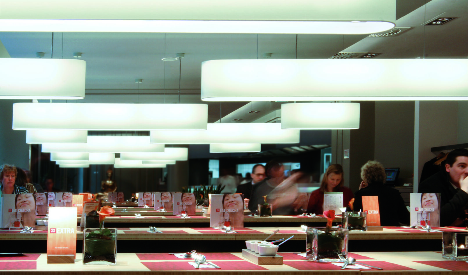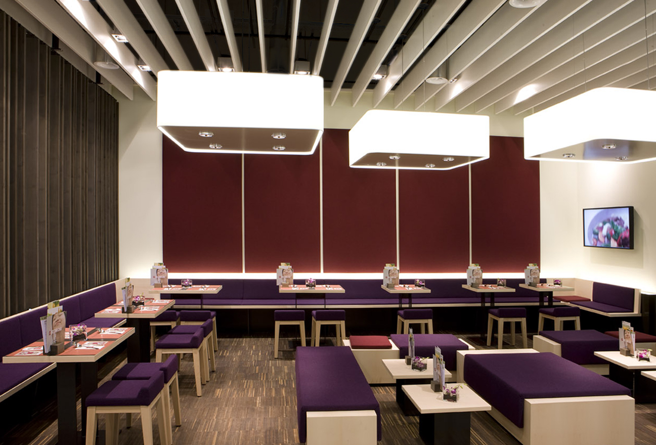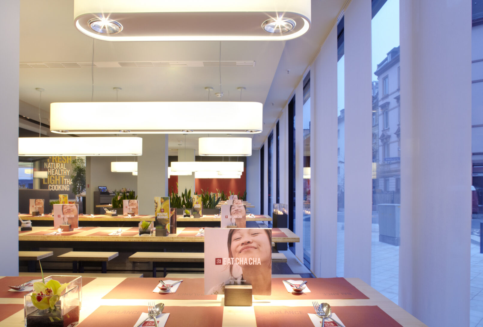 You won’t find plastic chairs here – instead, authentic, natural materials such as bamboo, wood and fabrics are combined with green tones on the walls and pure color accents; fresh table decorations and real planting in the interior as well as fabric lights create a feel-good atmosphere.